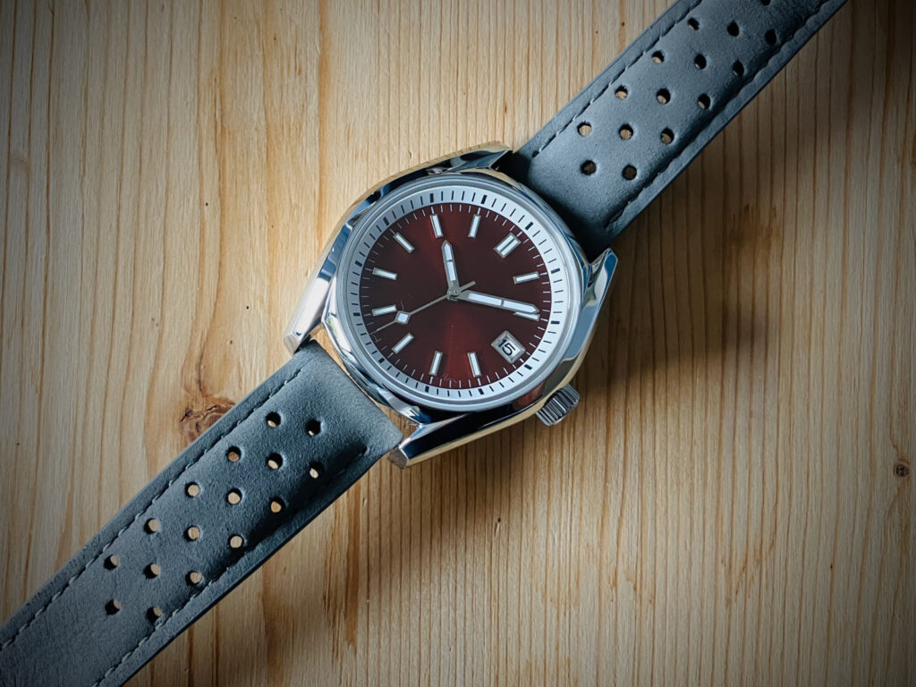 | Zifferblatt | dunkelrot Sonnenschliff mit weißen Indizes (28,5mm) |